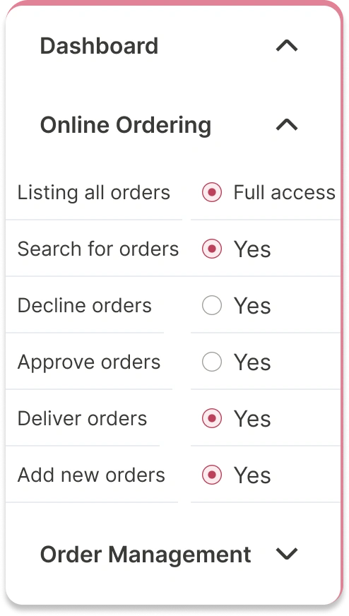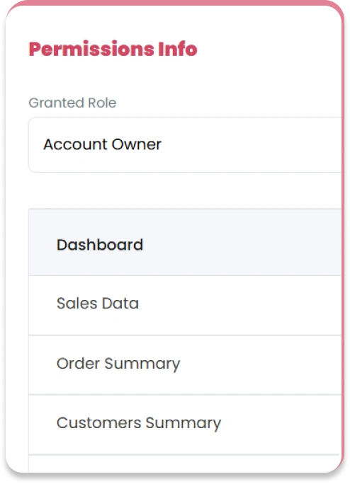 Customize permissions for each role to safeguard sensitive data and streamline workflows. By setting granular access levels, you can control which team members can view, edit, or manage specific features, such as financial reports, order details, or inventory management. This ensures that each role has access to only what they need, minimizing errors and maintaining the security